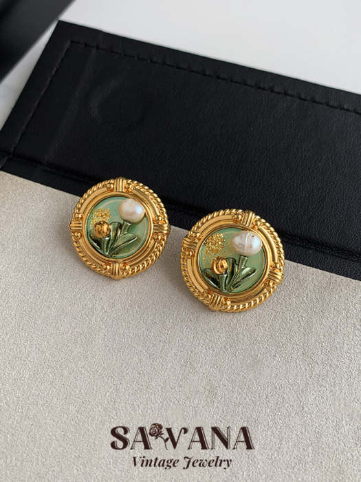 GOOYNN 24K Gold Plated Green Oil Painting Tulips Baroque Pearl Vintage Earrings GOOYNN 24K Gold Plated Green Oil Painting Tulips Baroque Pearl Vintage Earrings GOOYNN 24K Gold Plated Green Oil Painting Tulips Baroque Pearl Vintage Earrings